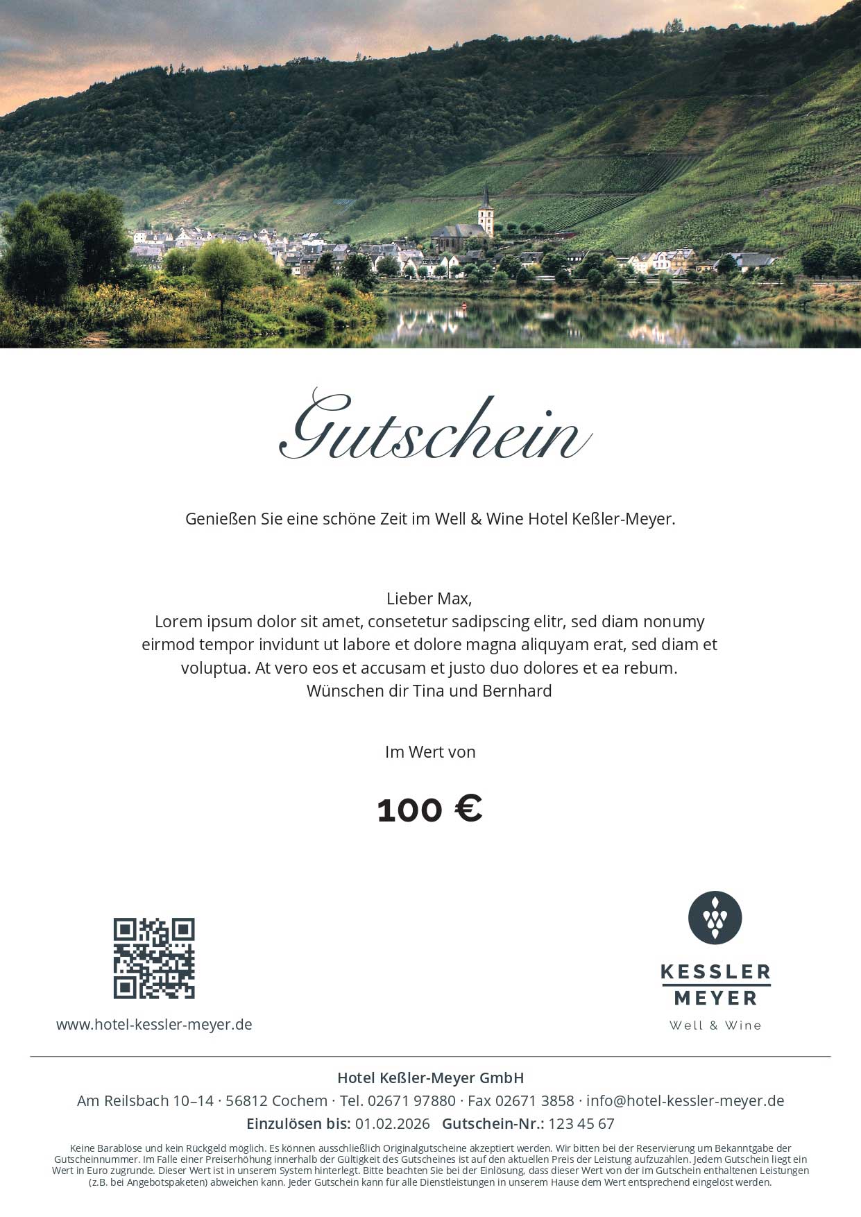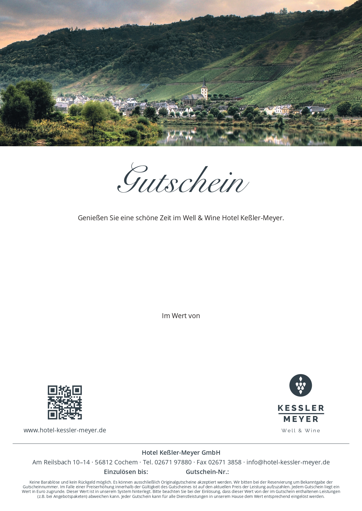 Mit einem Wertgutschein bereiten Sie Ihren Liebsten den Einstieg in einen wundervollen Aufenthalt im Hotel Kessler-Meyer. Wählen Sie Ihren Wunschbetrag und schenken Sie Erholung und Wohlergehen!